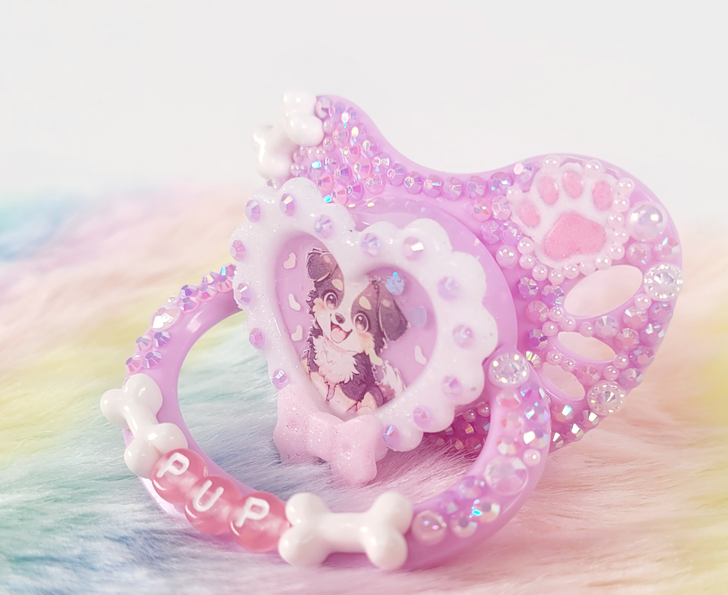 A pacifier for the precious baby pups out there! This adult pacifier features a cute little puppy in a heart made out of resin. It's fixed with gems, faux pearls, and other resin pieces.