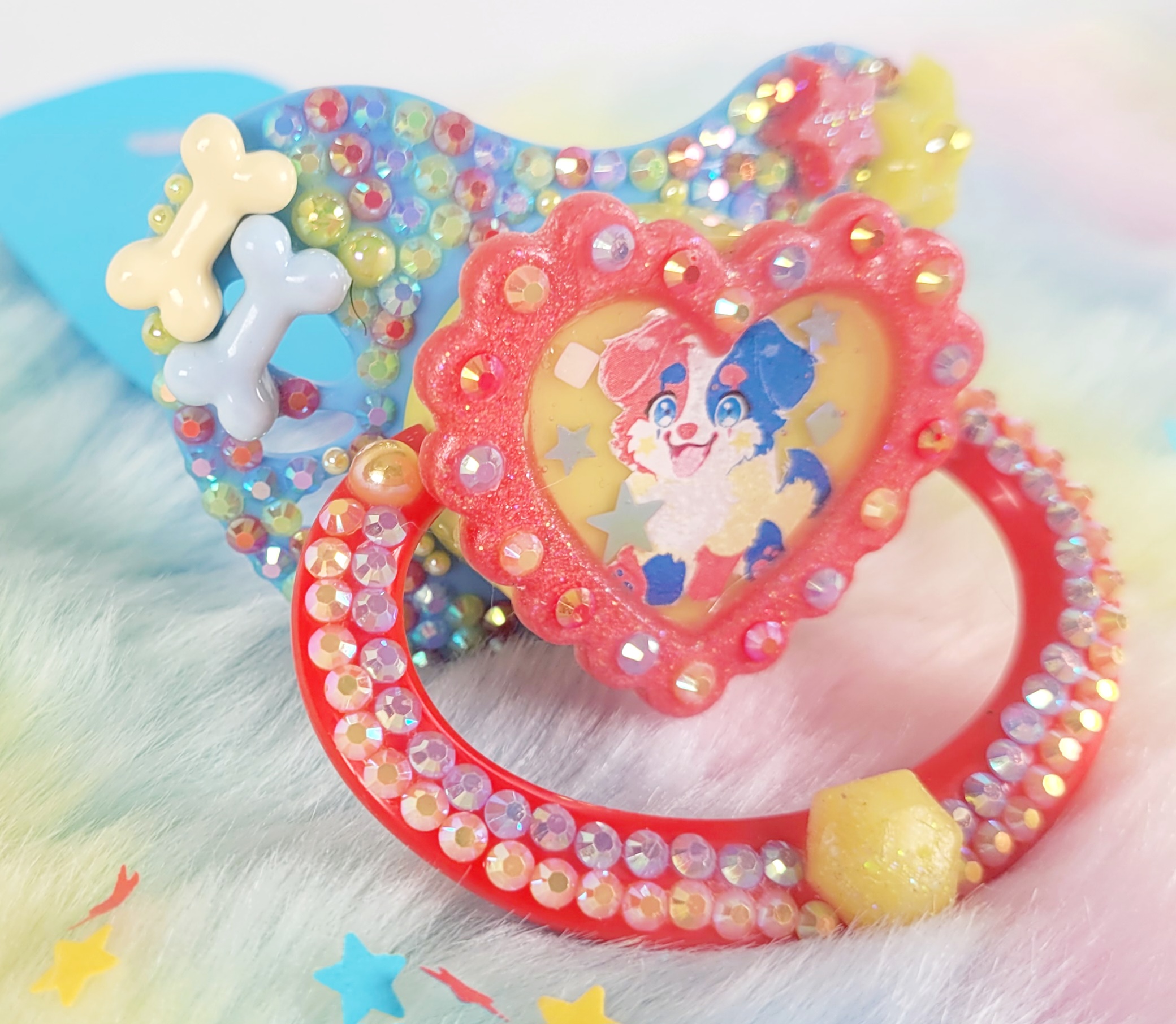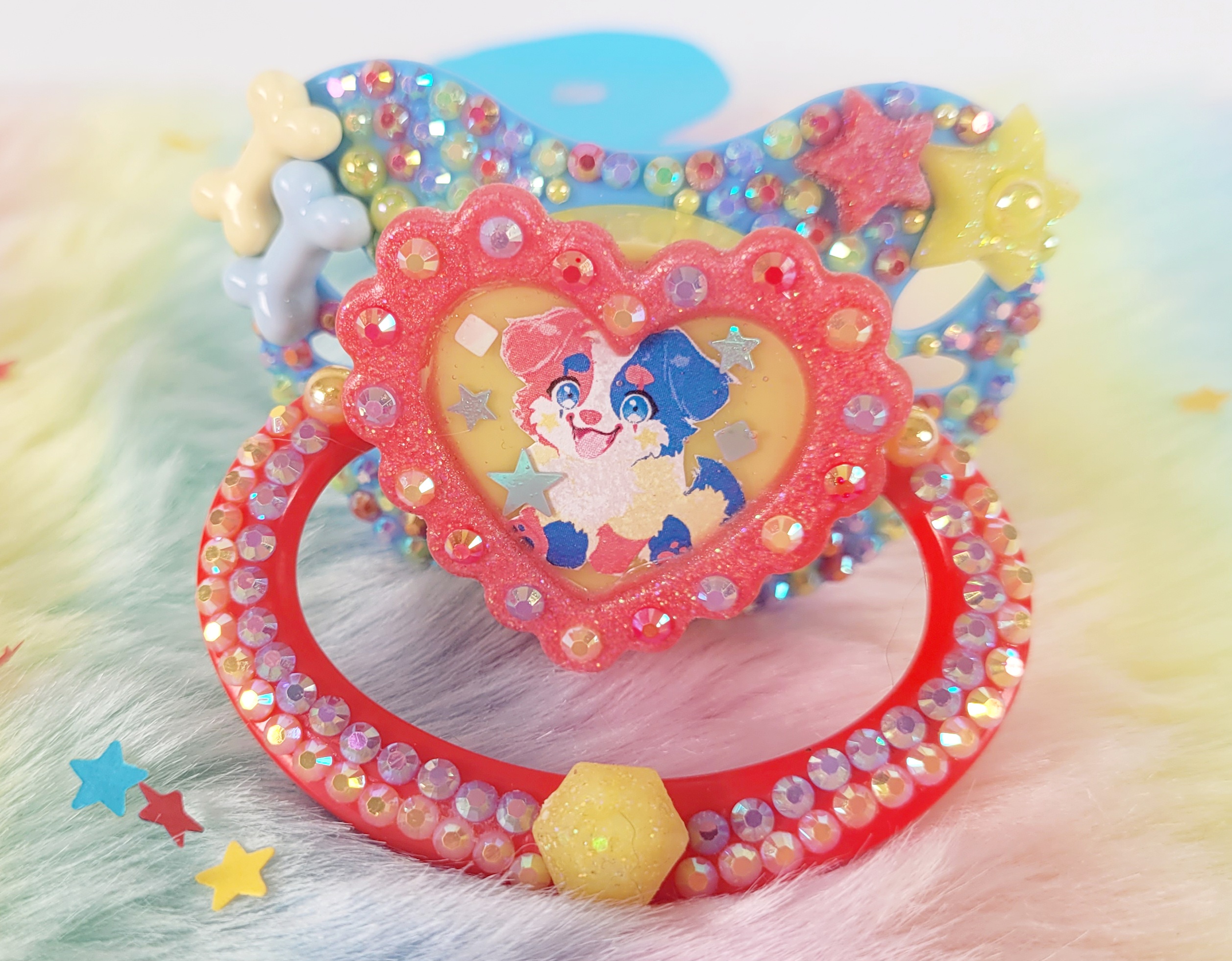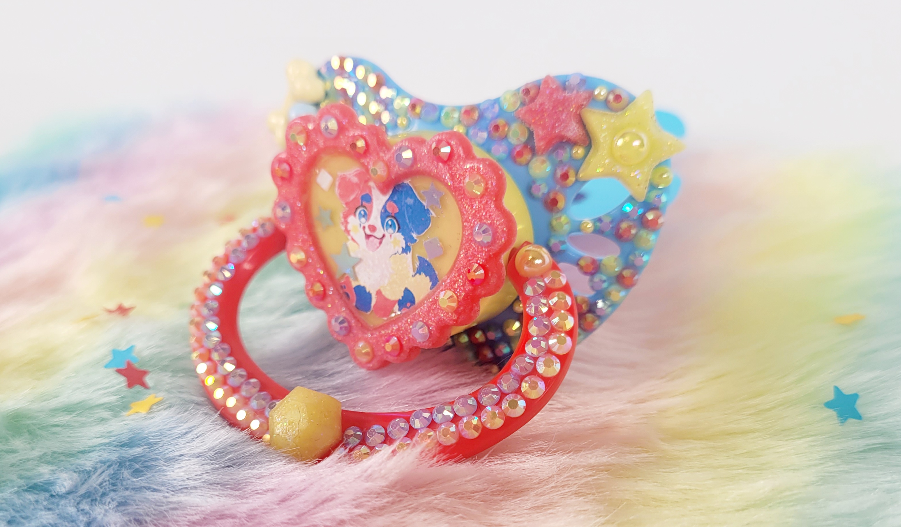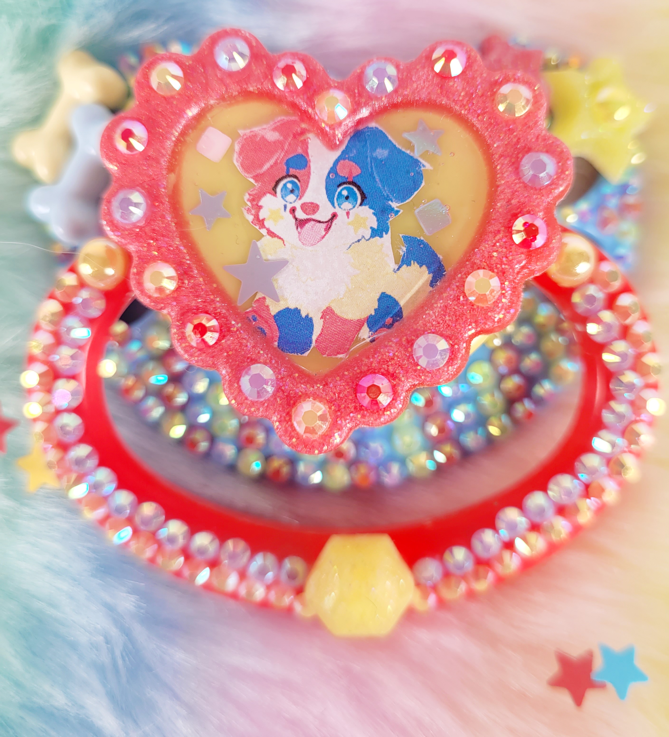Decorated with plastic pearls, and stars all securely fastened. Also featuring Some resin pieces created by me. Including the big resin heart with a cute little design.