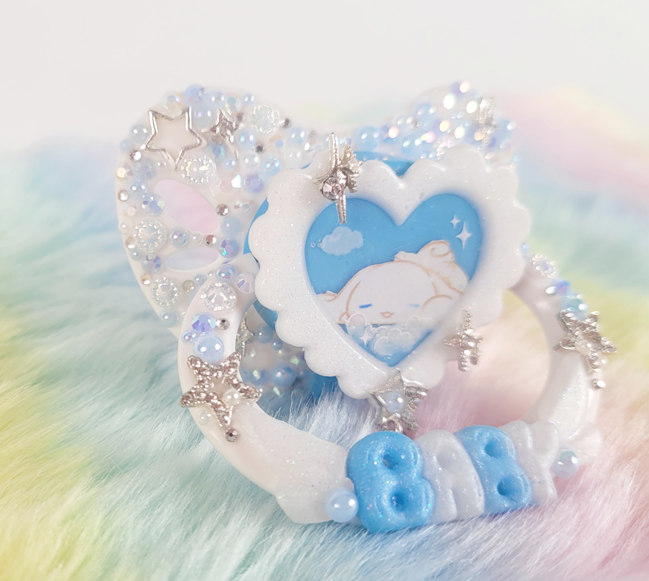 This pacifier features a large resin heart with the sleepy Cinnamoroll inside. And a decorated large adult guard with, resin pieces, gems, and mini faux pearls. To make it extra cute and sparkly!